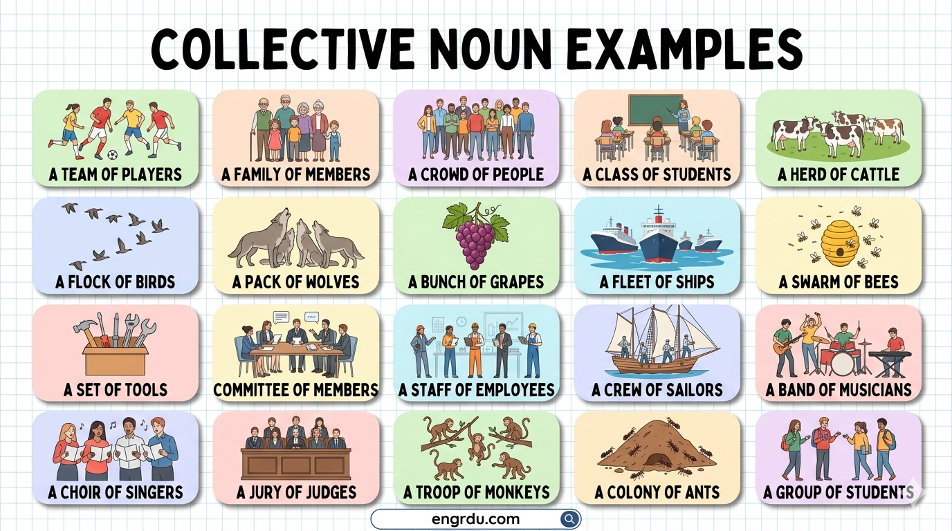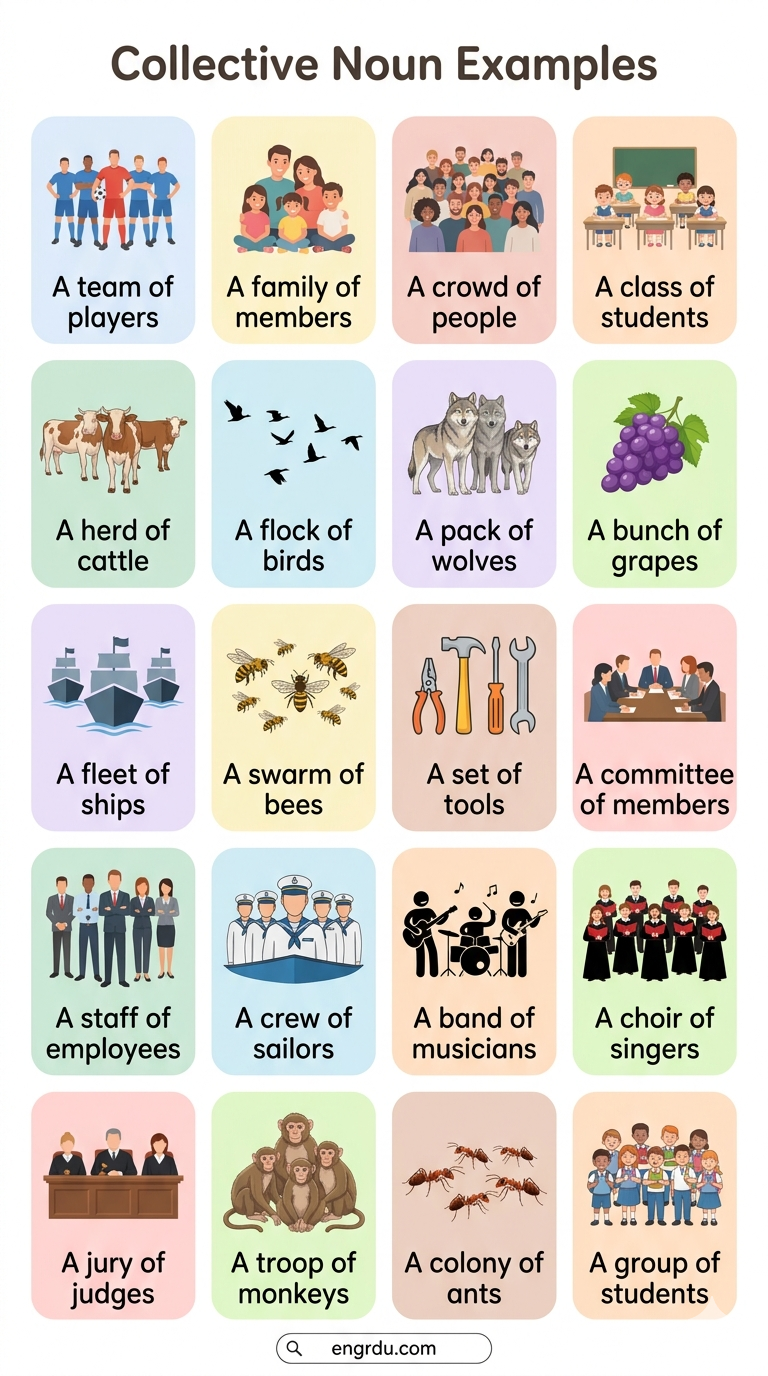 Collective nouns are special words used to describe a group of people, animals, or things as one unit. Instead of saying many birds or many students, English uses words like flock, team, or crowd to make sentences more natural and meaningful. Learning these words helps you understand how English speakers talk about groups in daily life, school, stories, and real conversations.