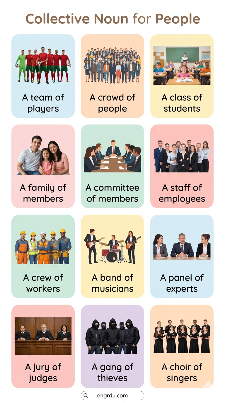 Common collective nouns for people include team, family, crowd, class, committee, staff, and crew. These words describe groups working, living, or gathering together.