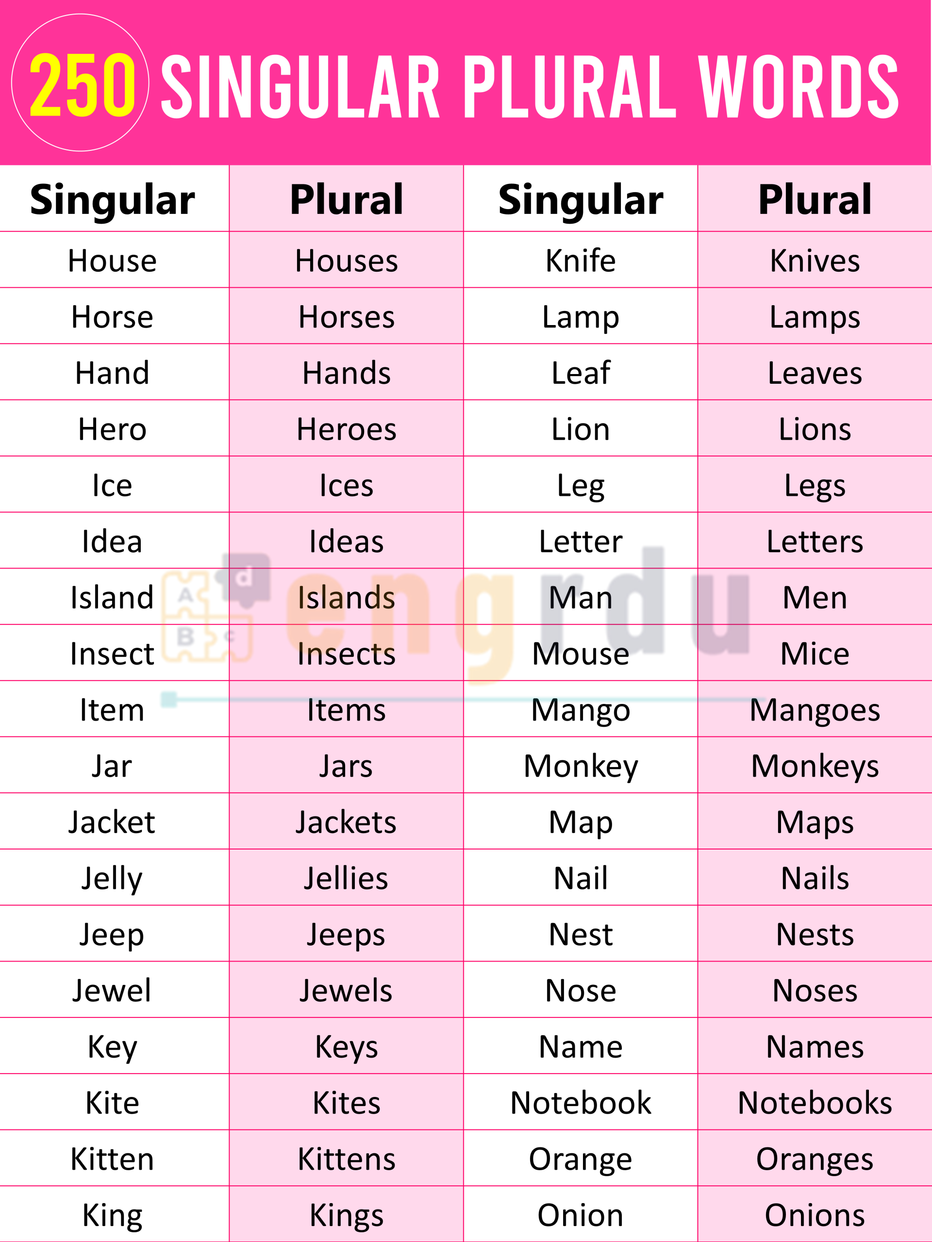 Below is the list of 250 common Singular and Plural words for easy learning.