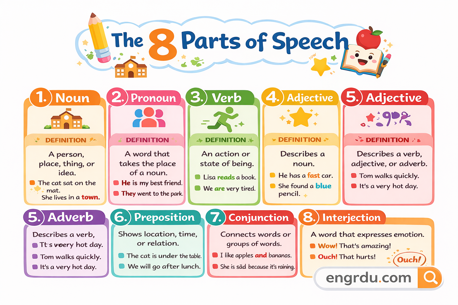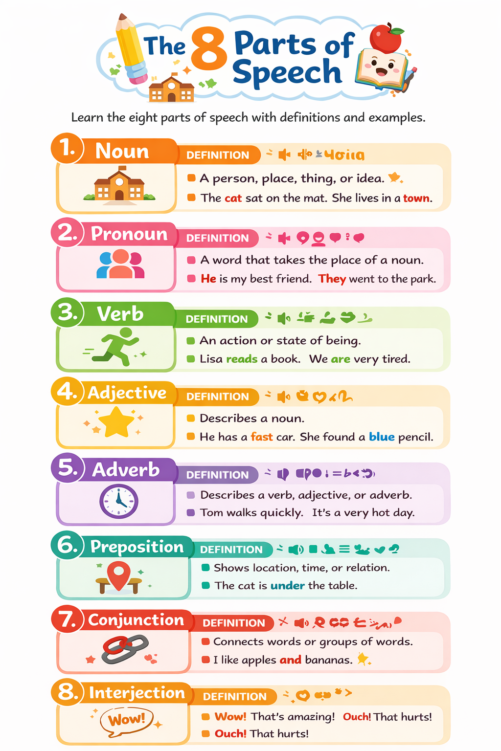 The 8 parts of speech are the foundation of English grammar. They help learners understand how sentences work and how words connect. By learning their definitions, uses, and examples, you can improve reading, writing, listening, and speaking skills. Practise daily, use simple sentences, and apply grammar in real life. With time, English will feel natural and clear.