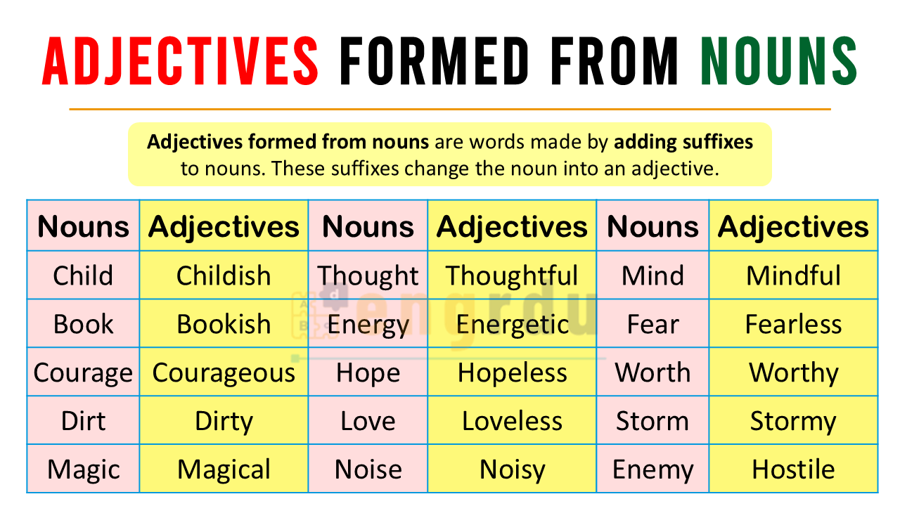 Adjectives formed from nouns are words made by adding suffixes to nouns. These suffixes change the noun into an adjective.