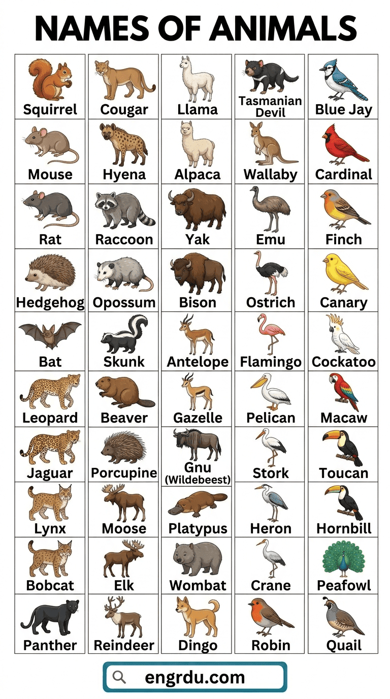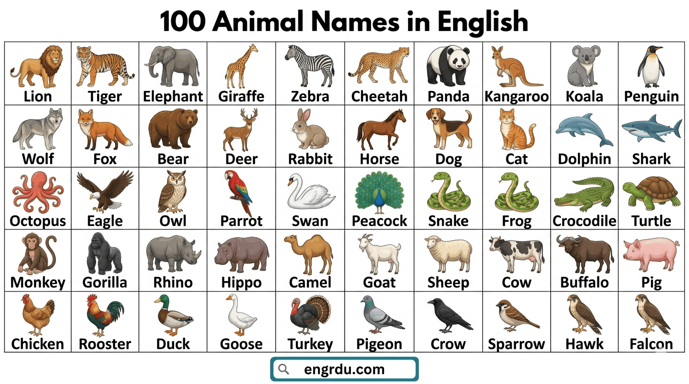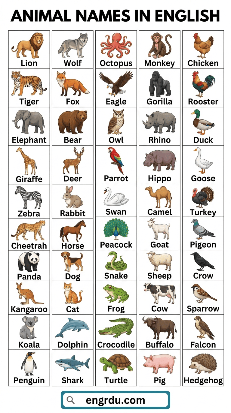 In this blog post, you will learn 100+ animal names in English with images. Knowing these names helps you understand animals when reading books, watching documentaries, or talking about nature. It also improves your speaking and listening skills because you can describe animals confidently in conversations. Seeing pictures with the words makes it easier to remember them and use them in writing or daily communication. Exploring a variety of animals will make your English vocabulary stronger and more interesting.
