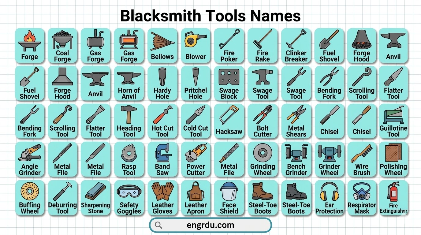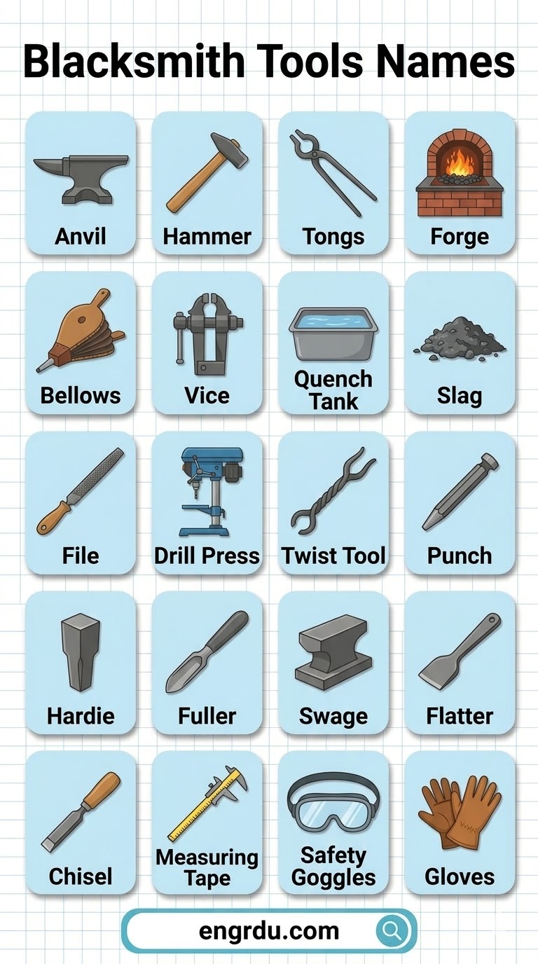 Blacksmithing requires many specialized tools for heating, shaping, cutting, and finishing metal. Learning blacksmith tools names and their uses helps English learners understand traditional metalworking vocabulary and workshop language.