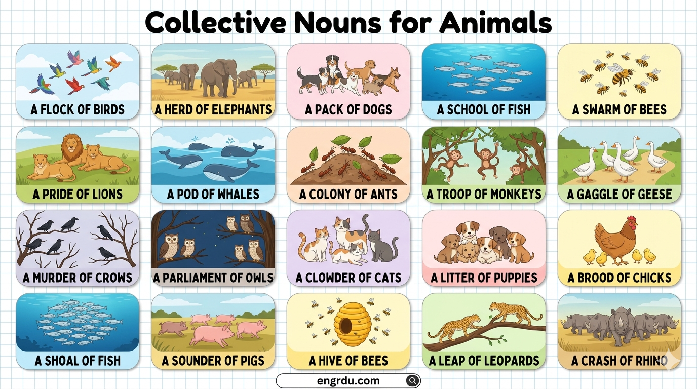 In this blog post, you will learn about collective nouns for animals, which are special words used to name groups of animals as one unit. Instead of saying many individual animals, English uses words like pack, flock, and herd to describe them together. These words are an important part of English vocabulary and appear often in reading passages, stories, and real conversations.
