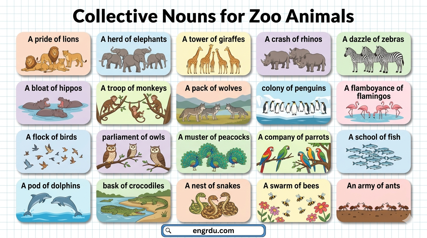 In this blog post, you will learn about Collective Nouns for Zoo Animals and how they help you describe groups like a pride of lions or a herd of elephants. These words are important because they improve your English vocabulary and make your sentences more natural. When you understand and use them, your speaking becomes smoother, your writing becomes more accurate, and your reading and listening skills also improve. By practicing these group names, you can communicate clearly and understand animal descriptions with more confidence.