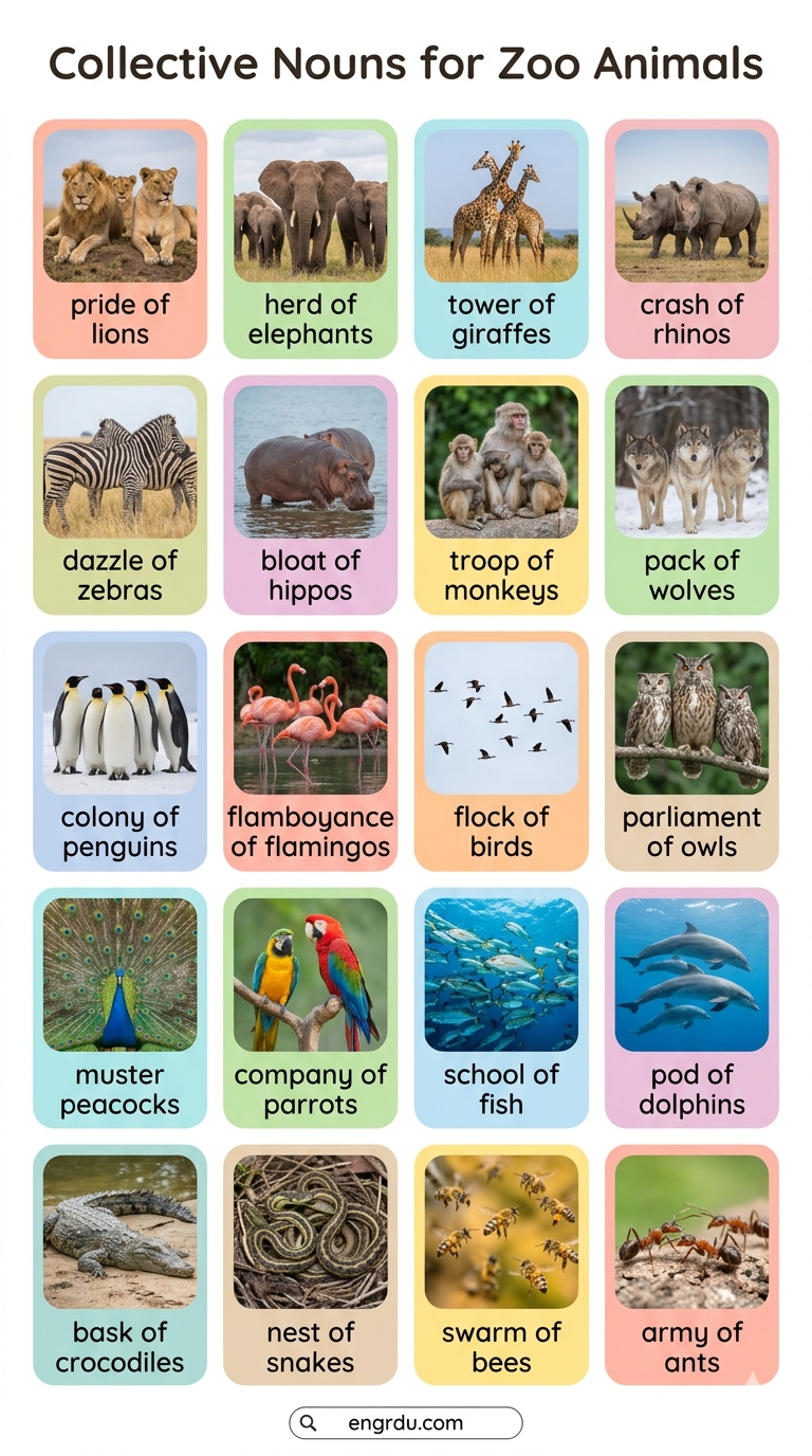 Collective nouns for zoo animals add richness and clarity to English. Learning them helps you describe groups like a herd of elephants, flamboyance of flamingos, or pack of wolves in a more natural way. With regular practice, these terms become easy to remember and use in daily communication.