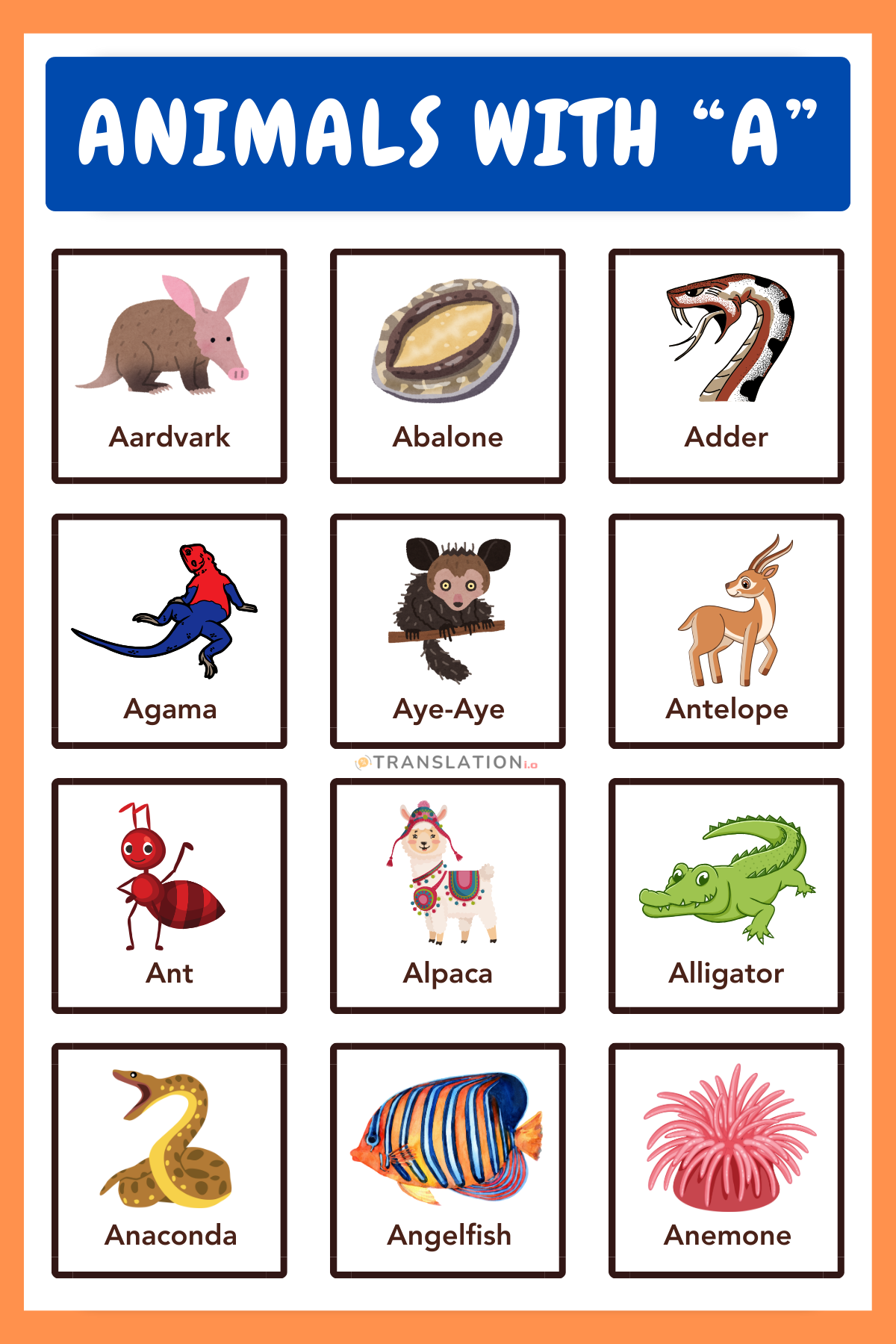 Here, you will learn animal names that start with A. Each one has a picture and a simple meaning to help you understand quickly and remember easily.