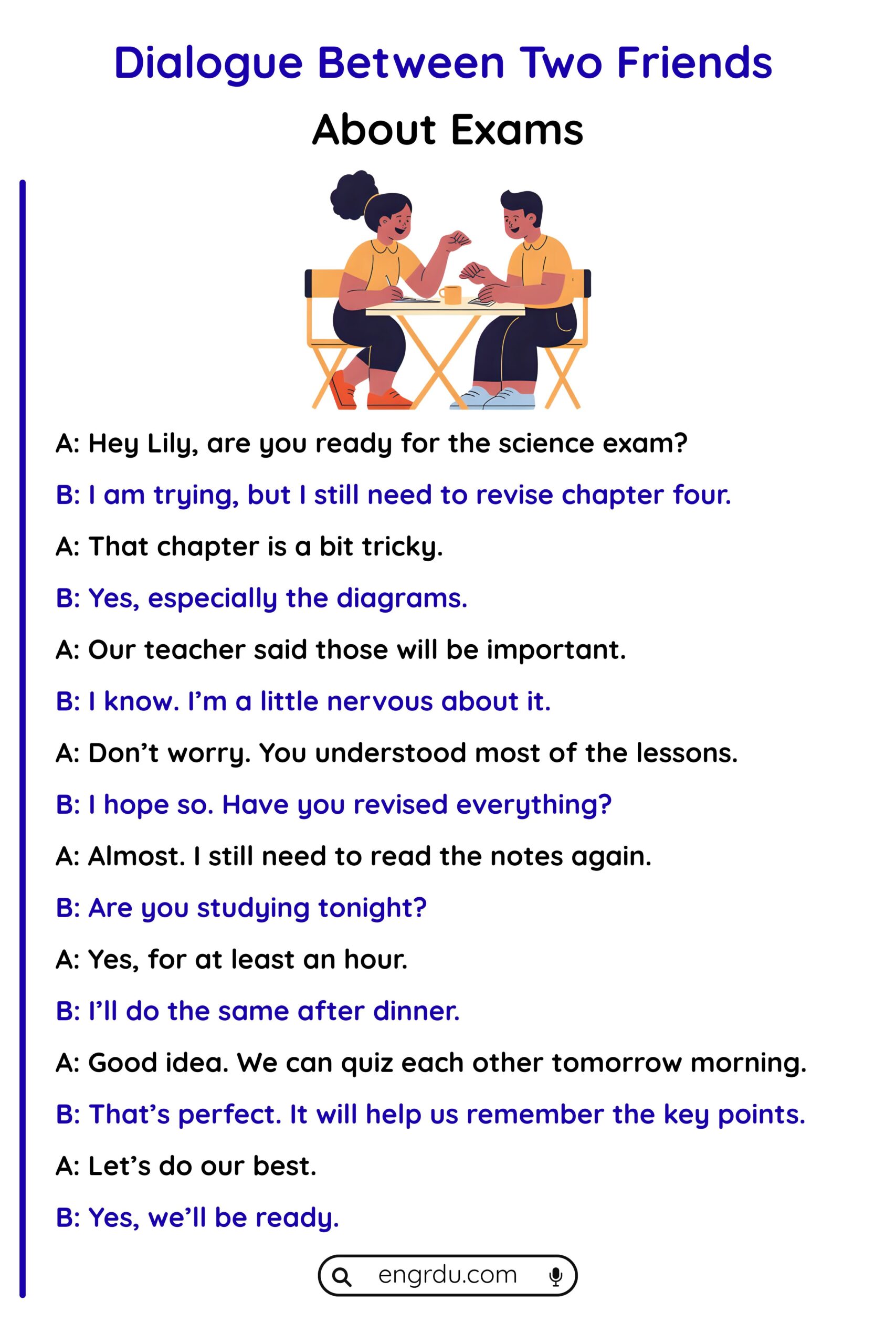 A dialogue between two friends about school is a simple and friendly conversation used in everyday speaking. It helps learners talk about subjects, exams, teachers, and school routines with ease. With the vocabulary lists, phrases, and sample dialogue provided, you can now create your own school conversations confidently.