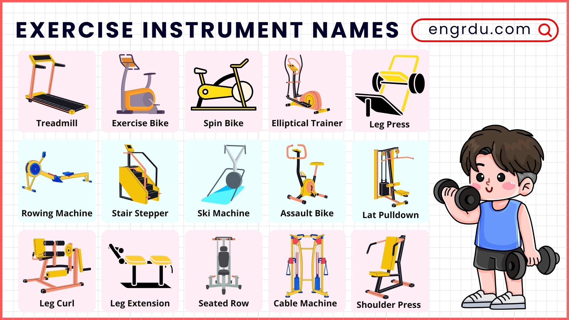 Learning exercise instrument names in English is important for students, gym-goers, and anyone who wants to speak about fitness.