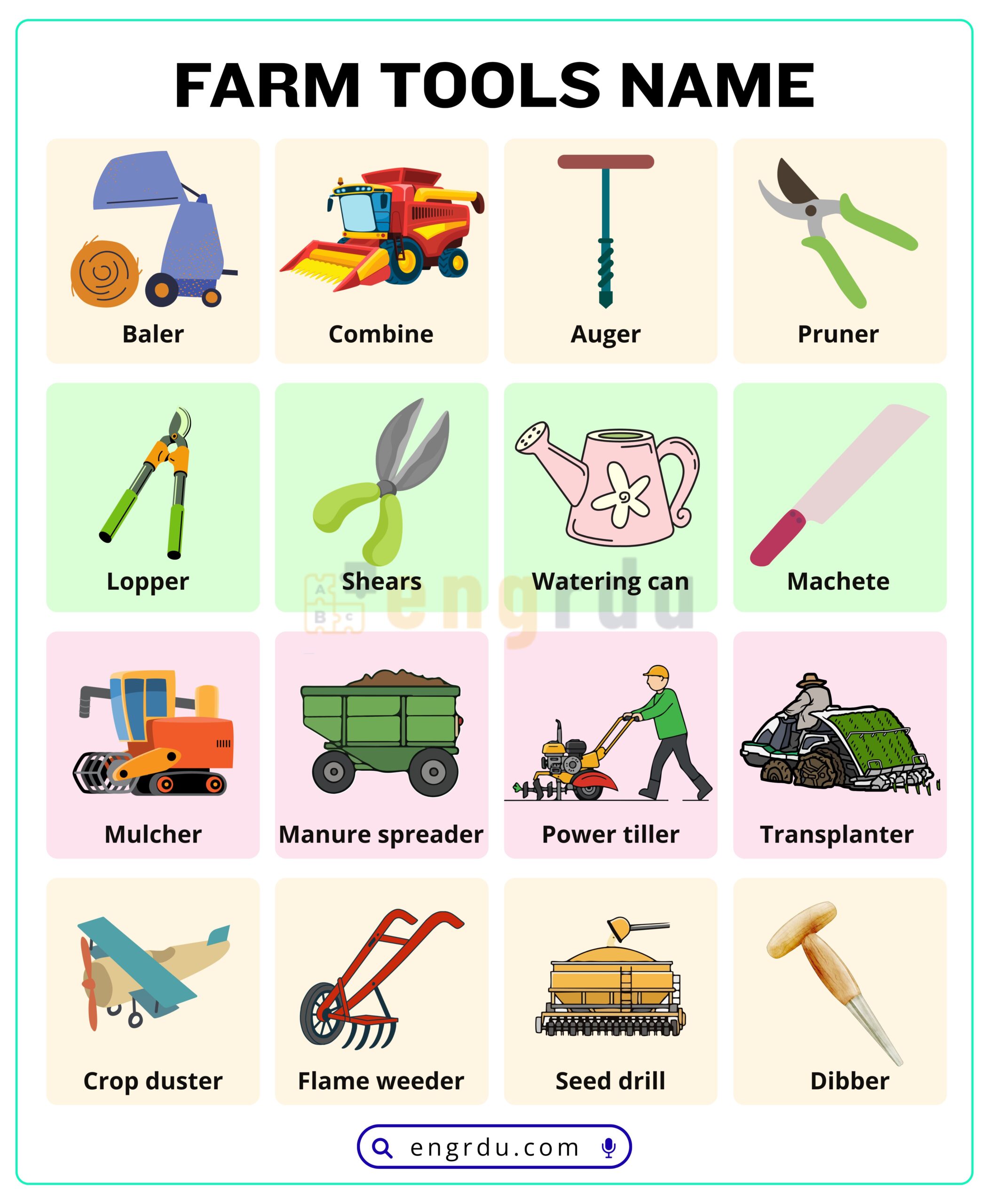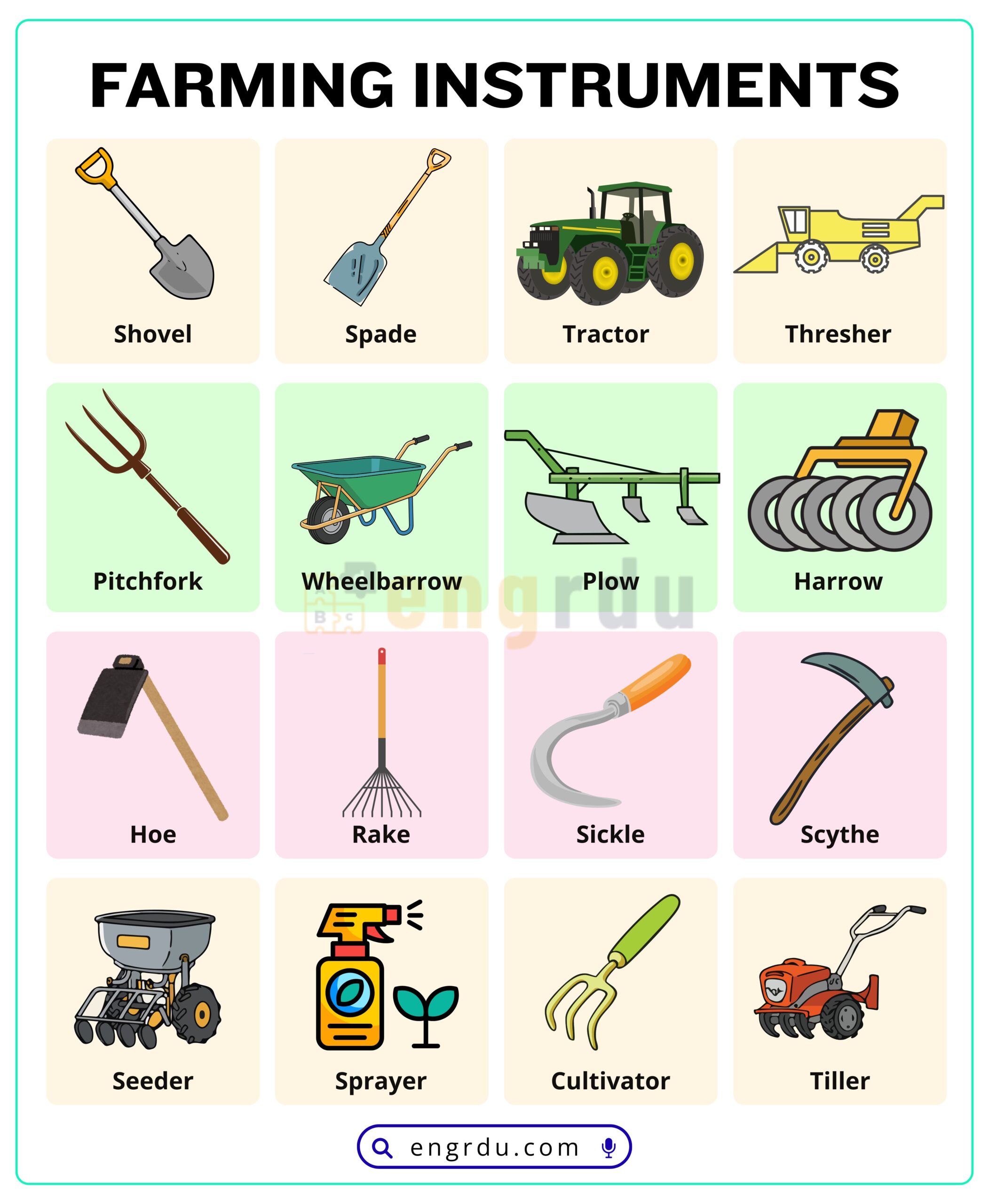 Practice these words regularly, and soon you will recognize many farming tools used around the world.