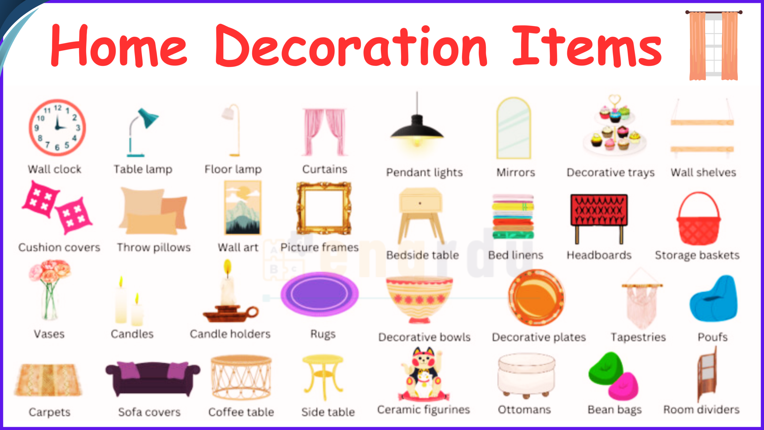 In this blog post, you will learn 60 home decor items names in English with pictures. Knowing these names helps you understand conversations about interior design, shopping, and home decoration. It also improves your speaking and writing skills because you can describe your home clearly and confidently. Seeing pictures with the words makes it easier to remember them and use them in daily conversations. Learning home decor vocabulary will make your English stronger and more practical for everyday life.