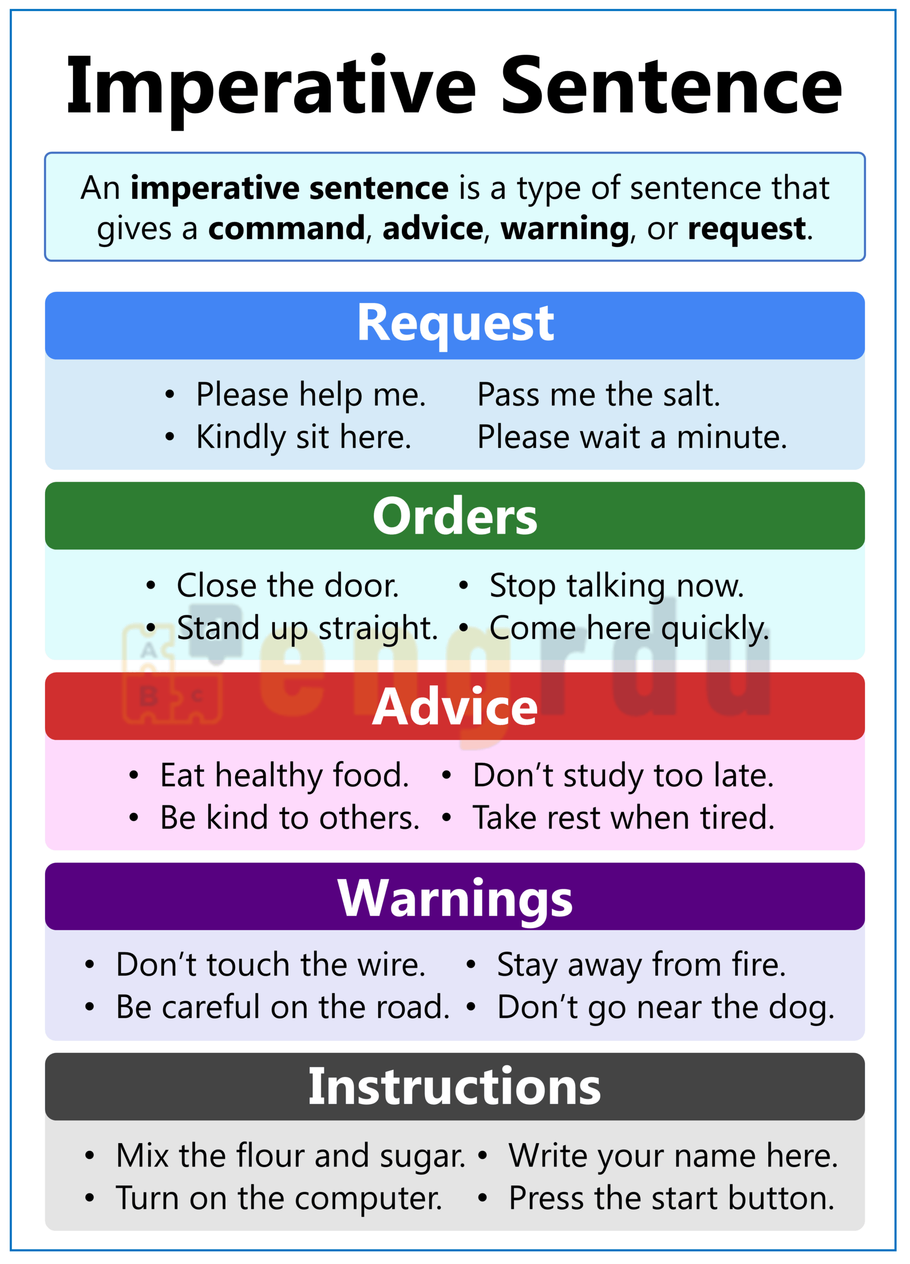 Imperative sentences are used in different situations in everyday English. Let’s understand them one by one: