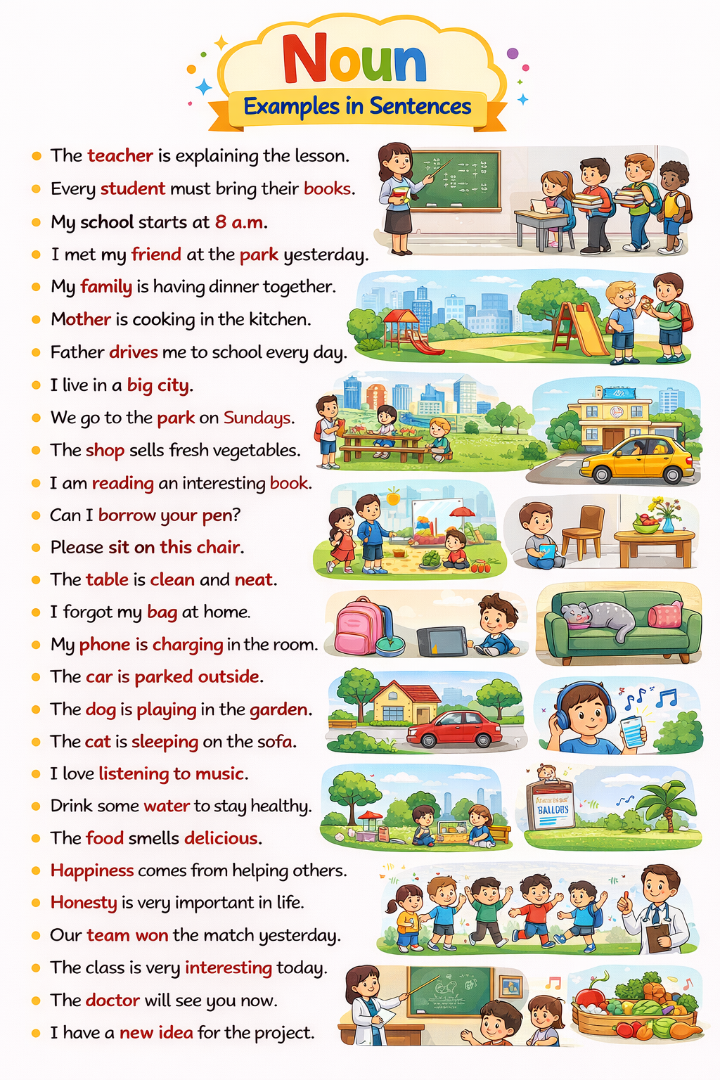 Here’s the list of noun examples in sentences for everyday conversation: