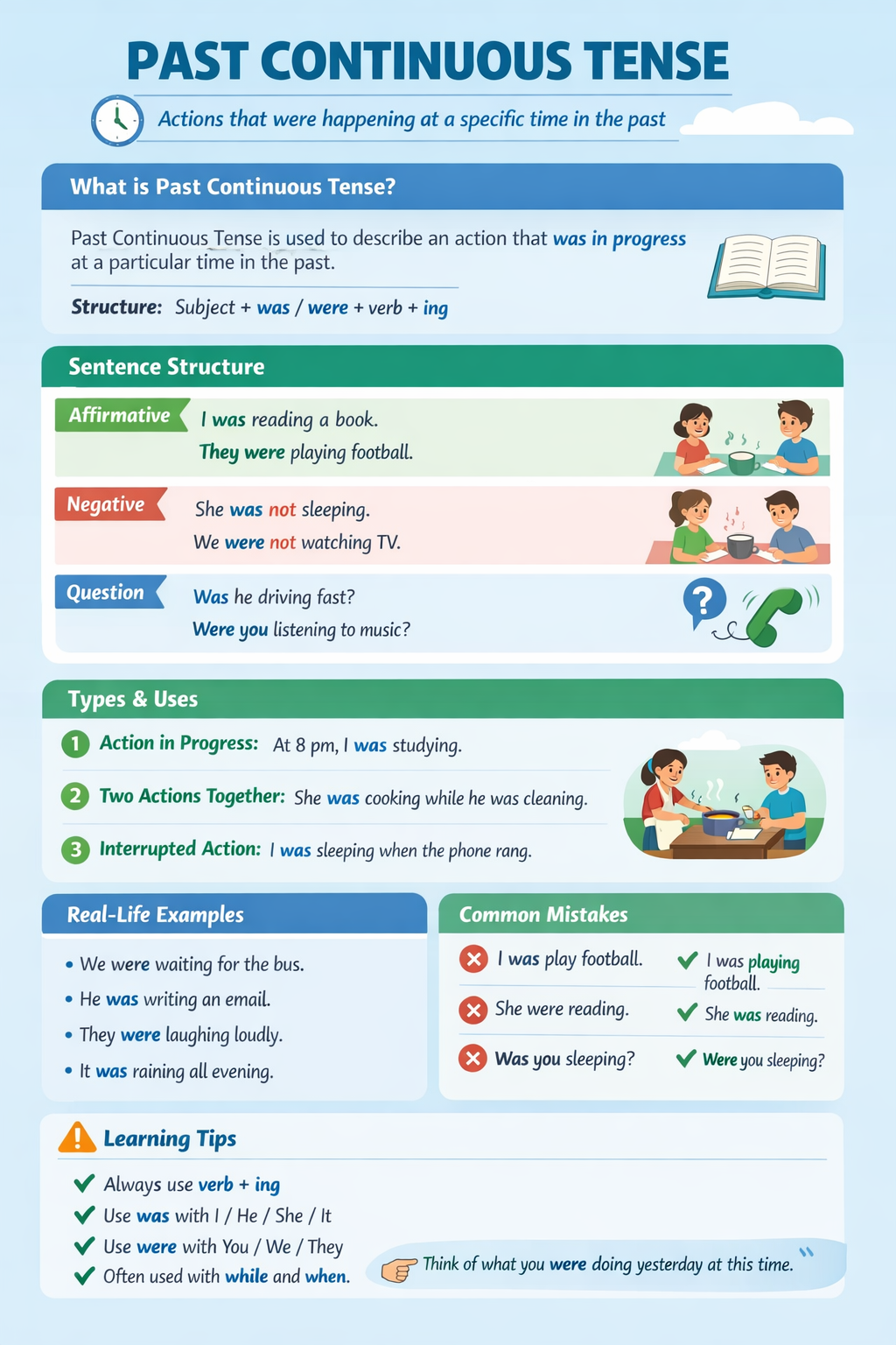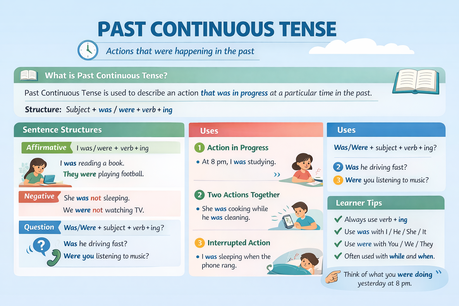 The Past Continuous Tense helps learners describe actions that were happening in the past. It is easy to form and very useful in real-life English. By understanding its structure, rules, and common mistakes, learners can use it with confidence. Practise using it in speaking and writing to make your English more natural and clear.