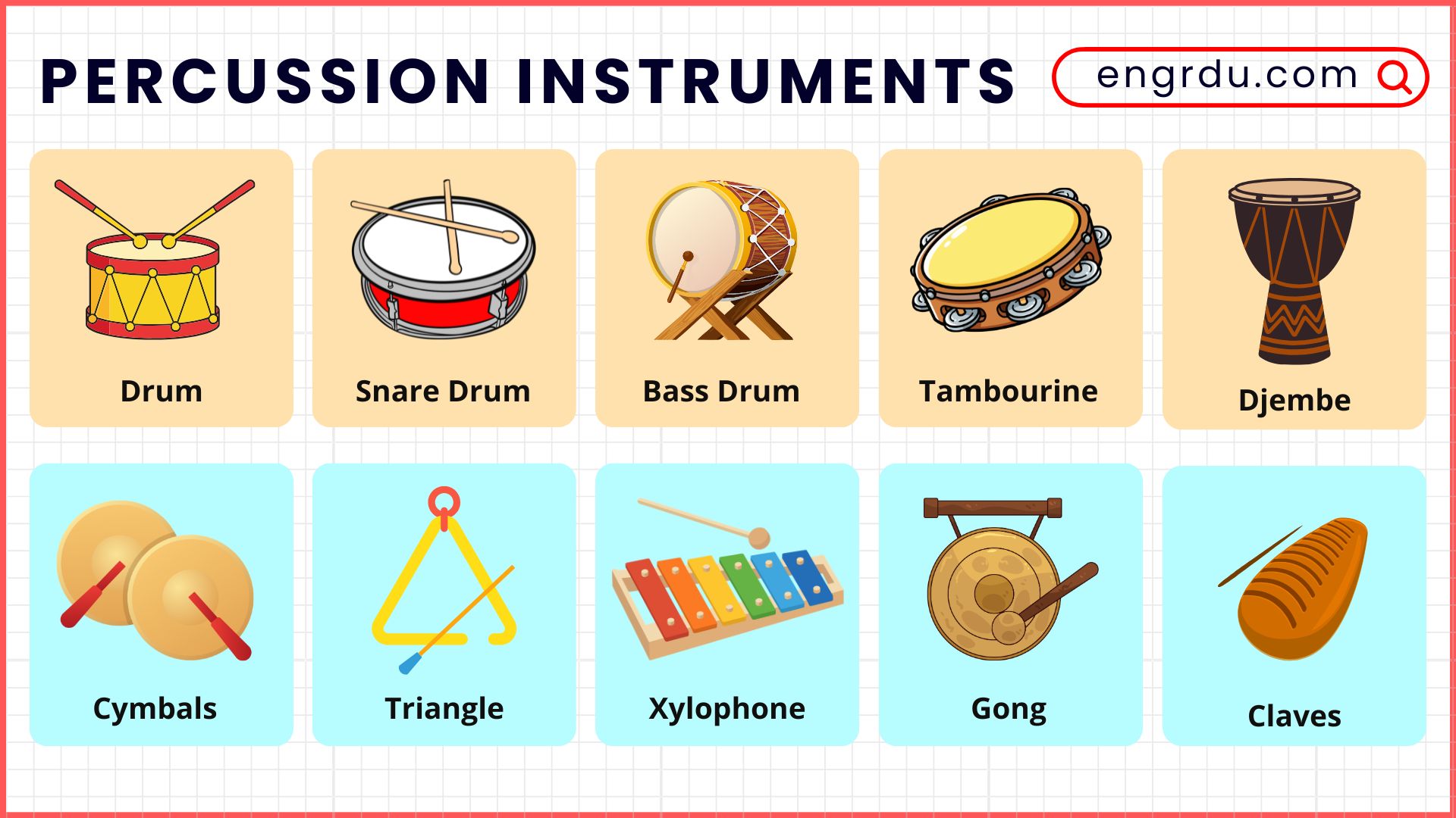 In this blog post, you will learn the names of percussion instruments and understand how they are used in music. Percussion instruments are tools that make sound when you hit, shake, or tap them, like drums, cymbals, and tambourines. Learning these words helps English learners master vocabulary that is useful for speaking, reading, writing, and listening. By knowing the names and uses of percussion instruments, you can describe music, follow lessons, and communicate confidently in English.