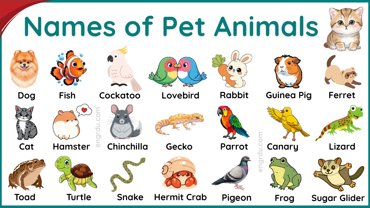Pet animals are our friendly companions that live with us at home. In this Vocabulary lesson, you will learn the names of pet animals along with pictures to help you remember them quickly. Knowing these names makes it easier to talk about pets, their care, and their habits in English. In this blog post, you will explore a variety of pet animals with pictures to practice, identify, and use their names confidently in sentences.