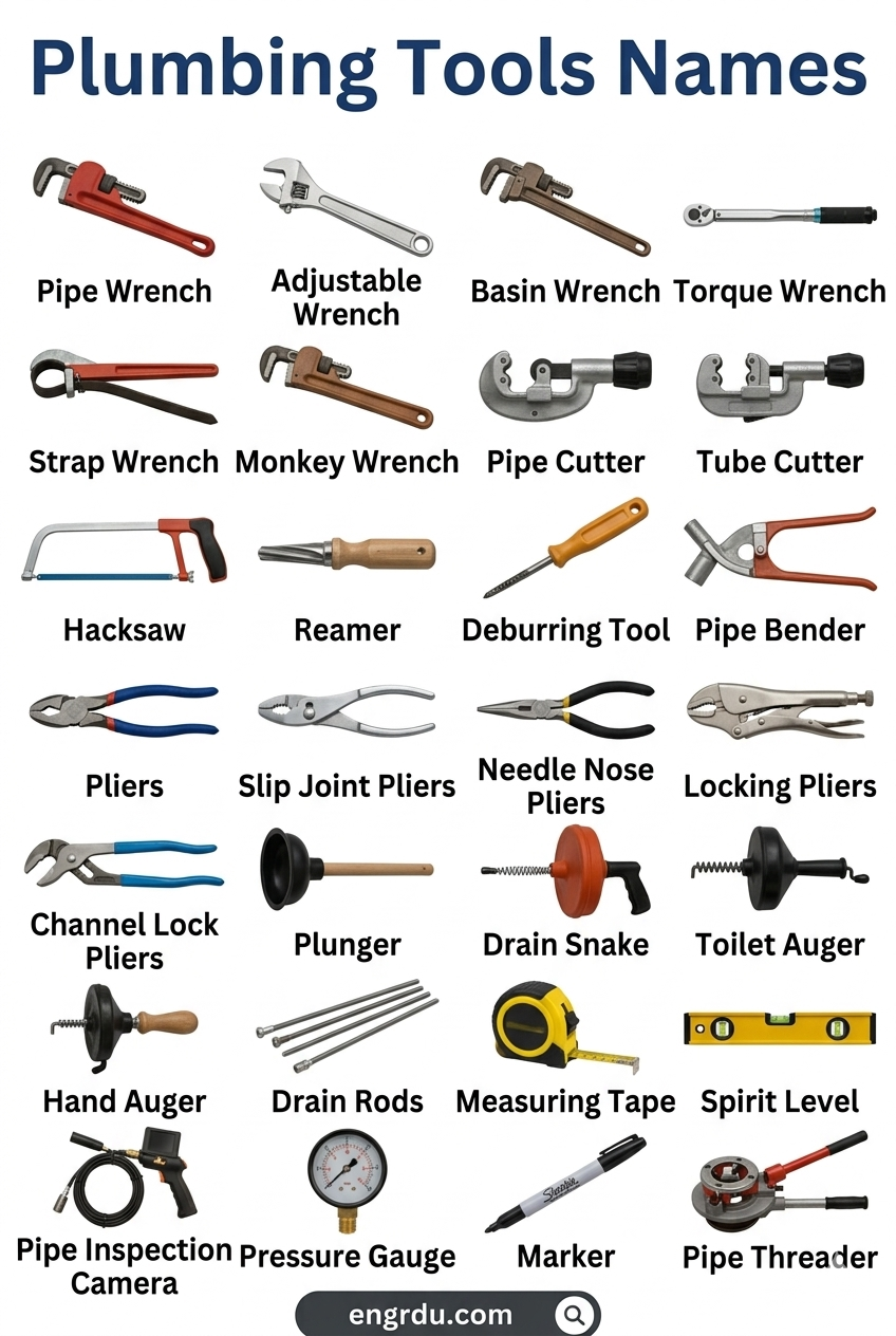 Plumbing tools are equipment used to install, fix, and maintain pipes, fittings, and water systems in homes and buildings.