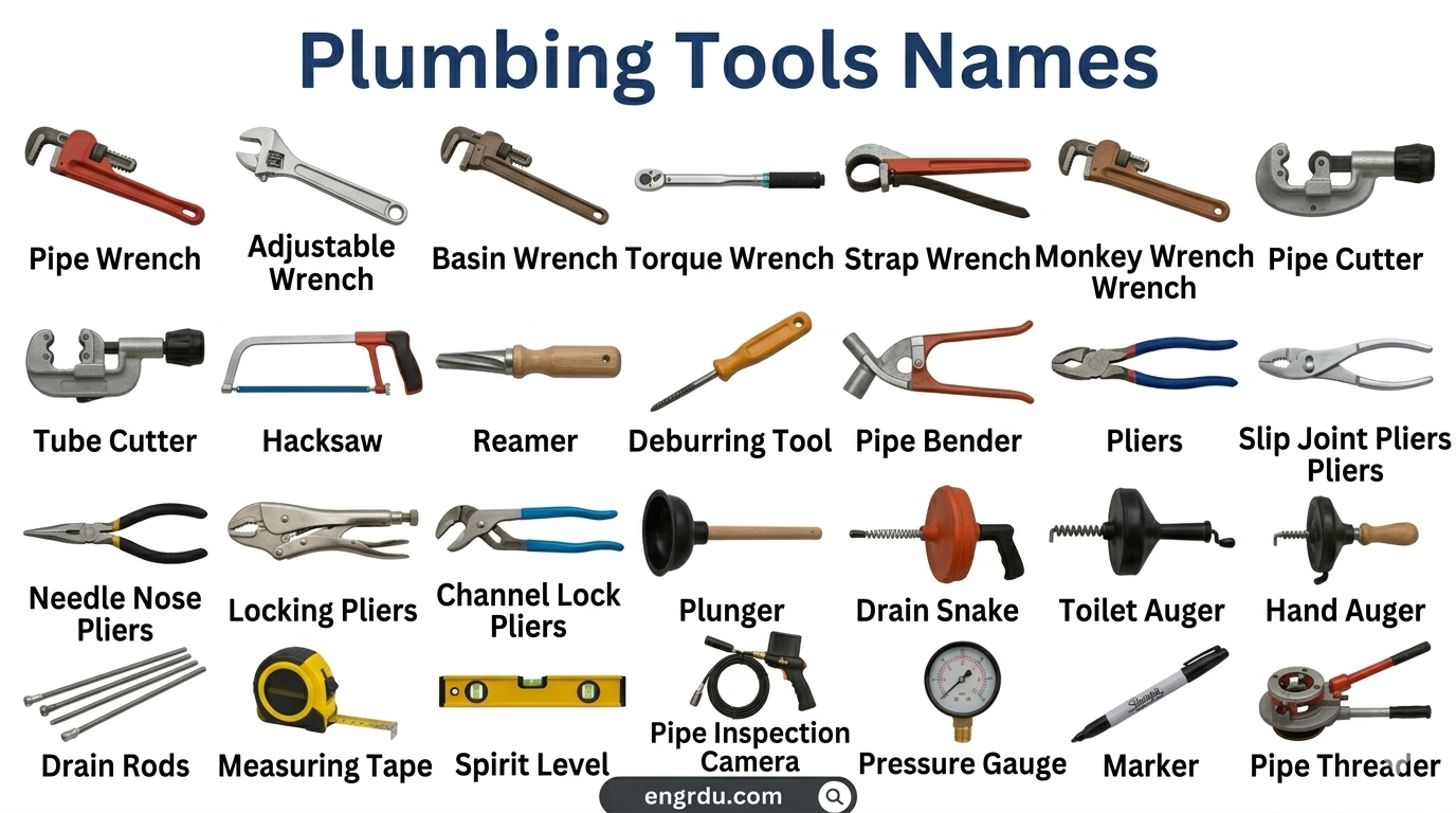 In this blog post, you will learn plumbing tools names, their uses, and how to understand them in real-life situations. These tools are used to install, repair, and maintain pipes, taps, and drainage systems. Learning this vocabulary helps you recognize tools and understand how they work in daily life.