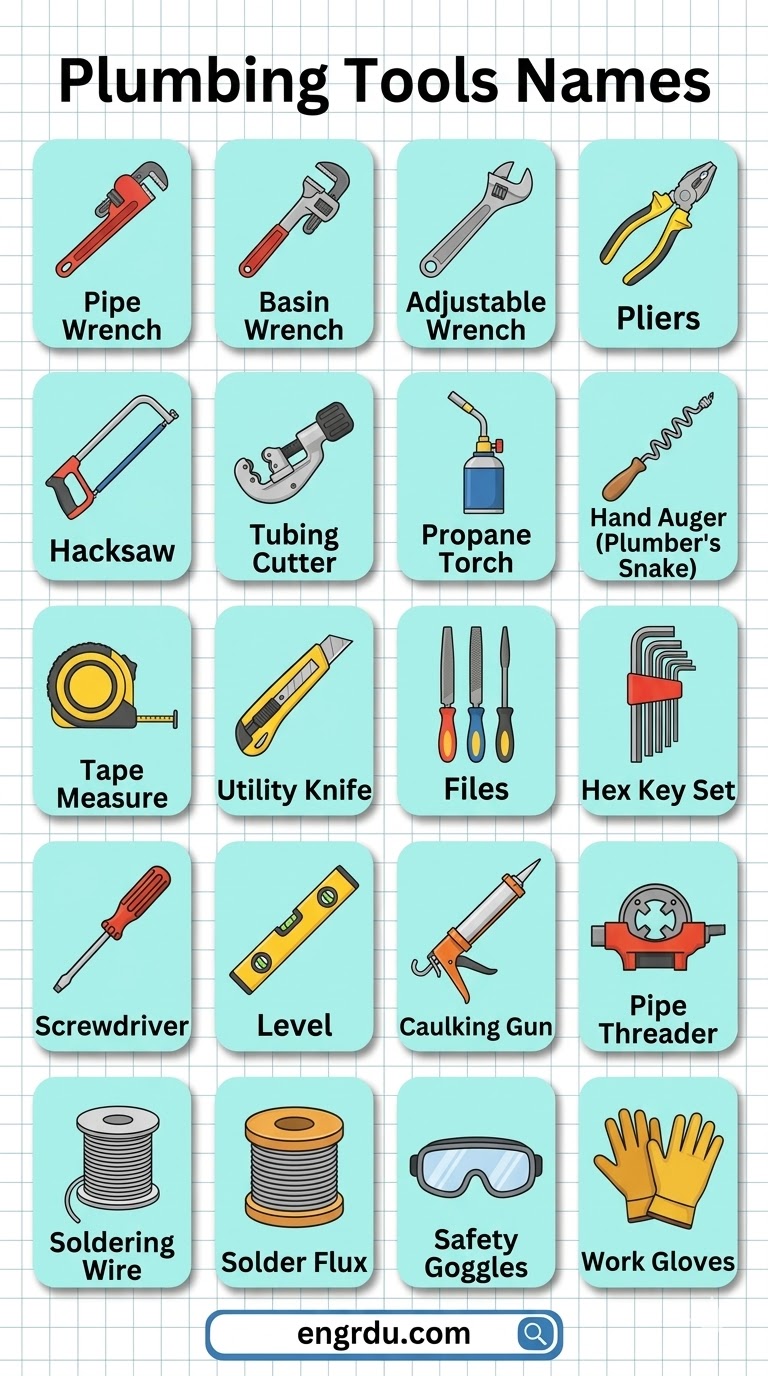 Plumbing tools names and uses are important for daily life and technical English learning. These words help you understand repairs and communicate clearly. Practice them regularly to build strong vocabulary and confidence.