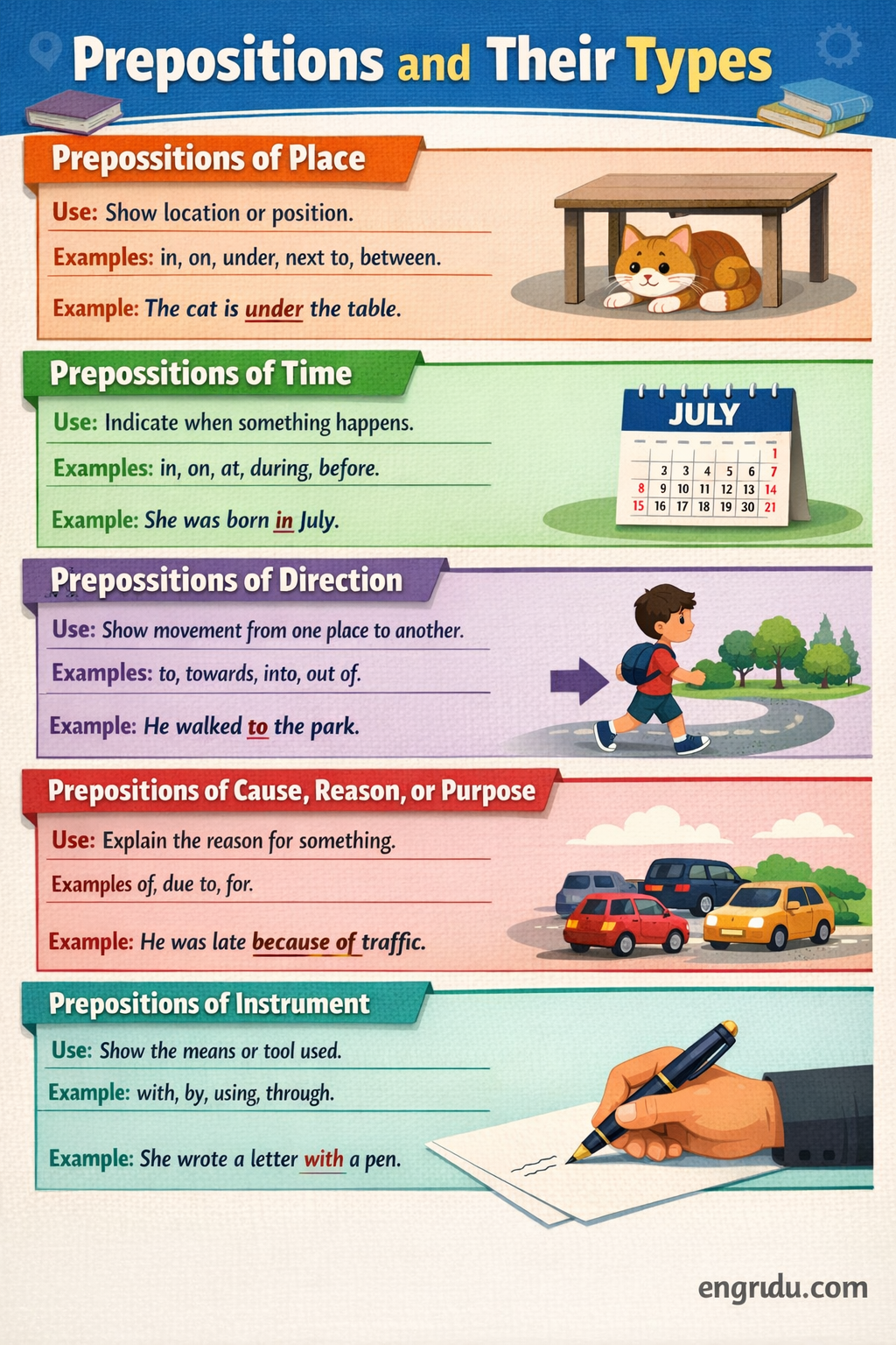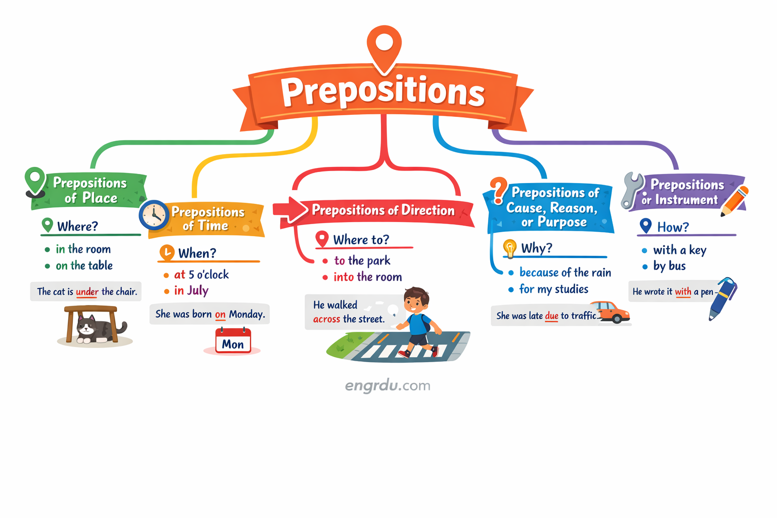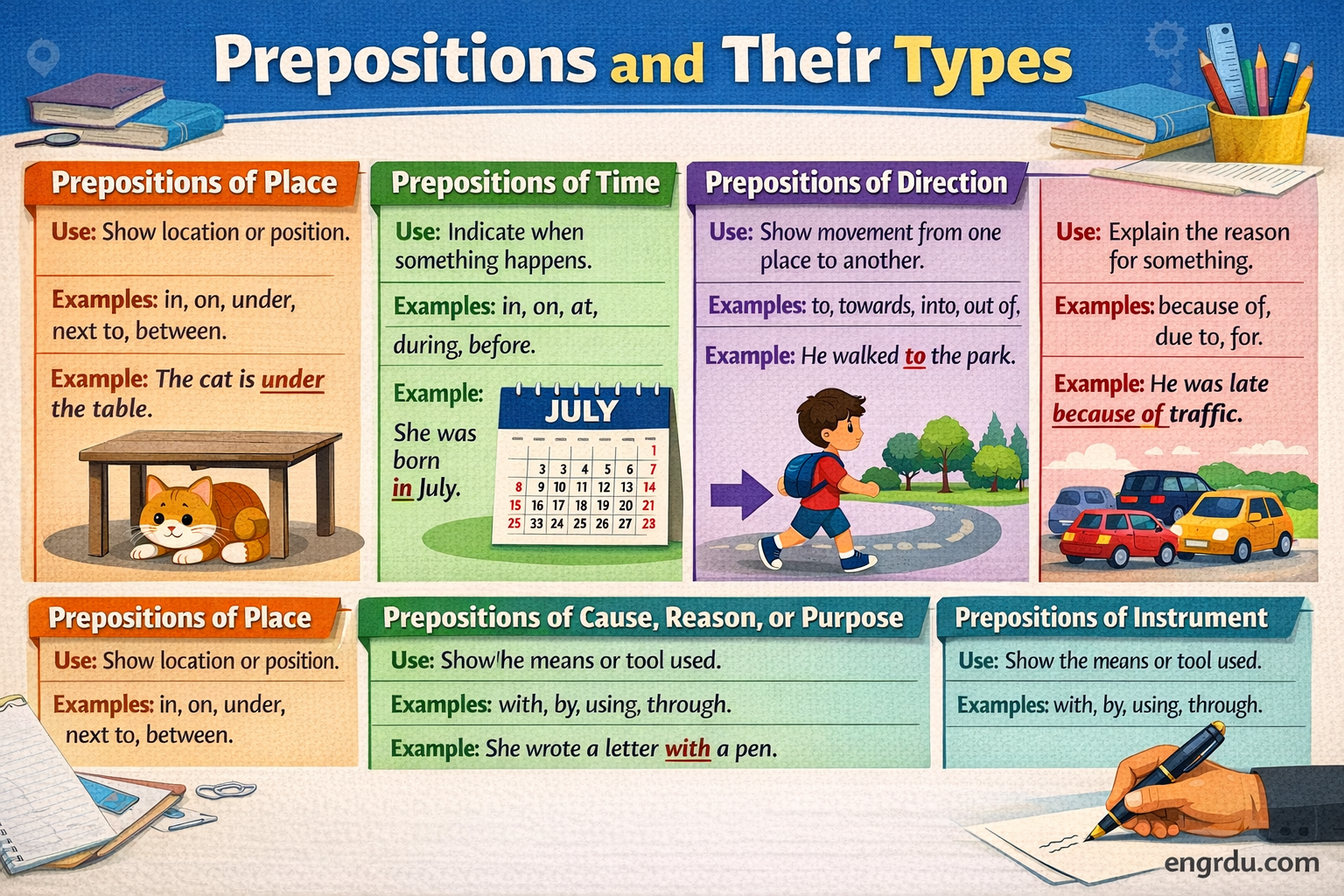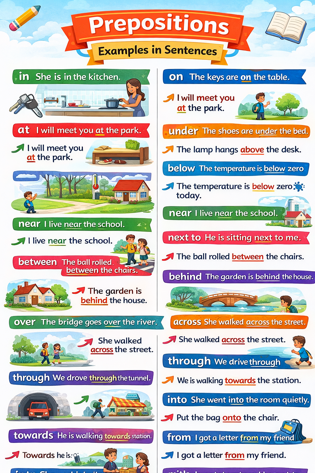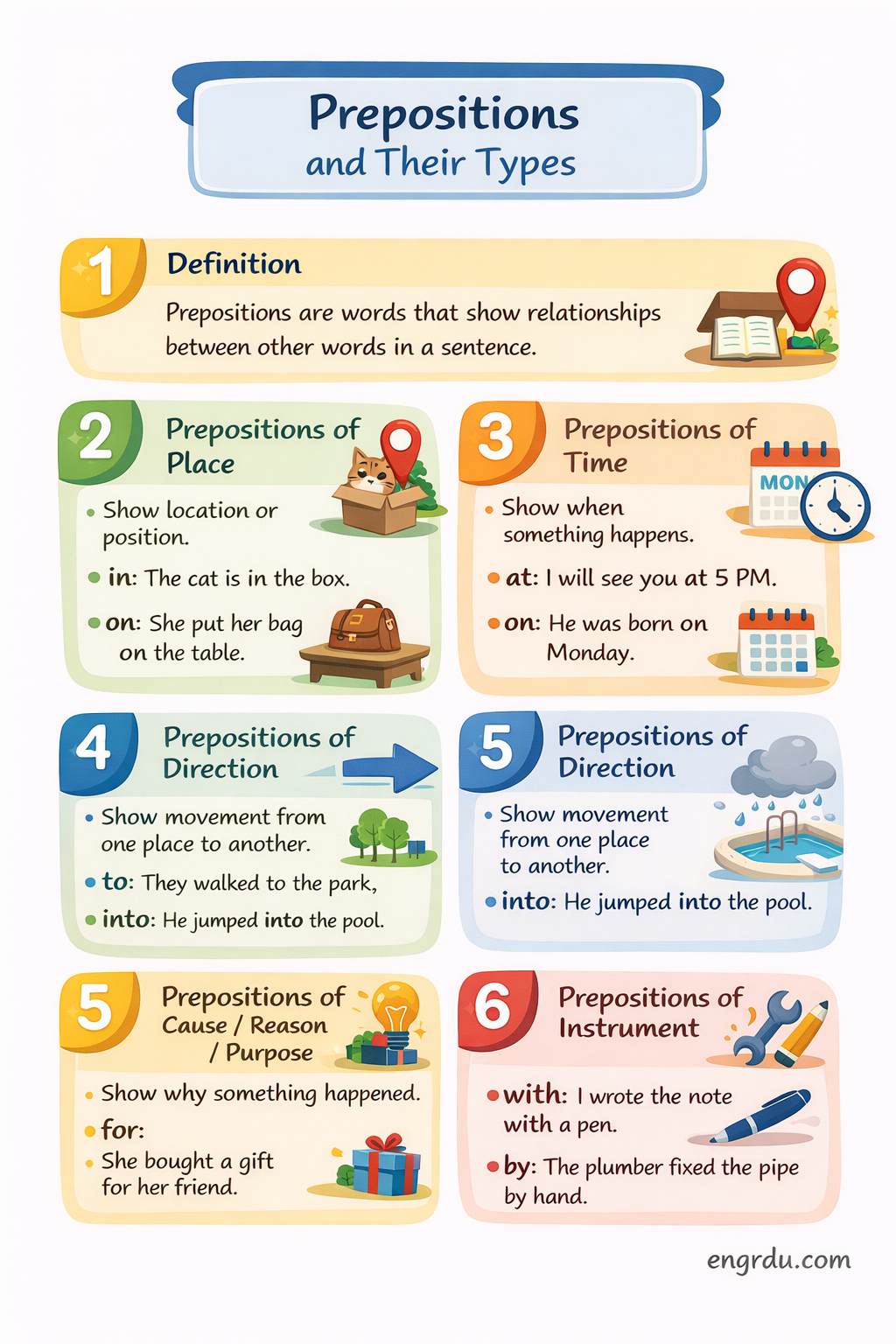 Prepositions are small words, but they make English sentences clear and correct. They show time, place, direction, cause, and manner. By learning the types, rules, and common mistakes, you can use prepositions confidently. Remember to practice with real-life examples and always check which prepositions go with certain verbs, nouns, and adjectives.