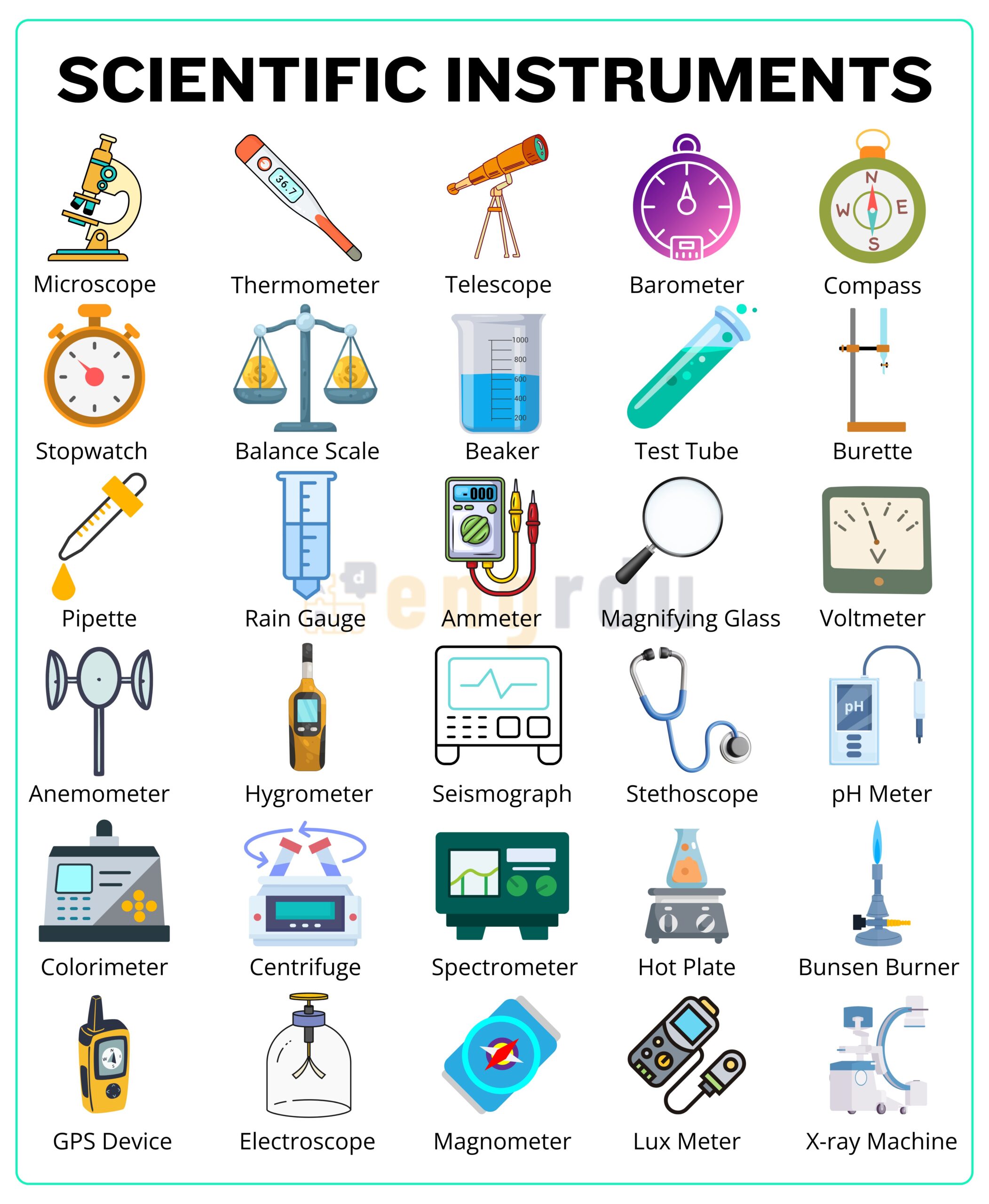 In this blog post, you will learn 100 scientific instruments names in English with their uses and pictures. Knowing these words helps you understand science lessons, follow experiments, and describe tools correctly. Learning scientific instruments improves your speaking, reading, writing, and listening skills. By practicing these terms, you can communicate confidently in school, labs, and everyday science discussions.